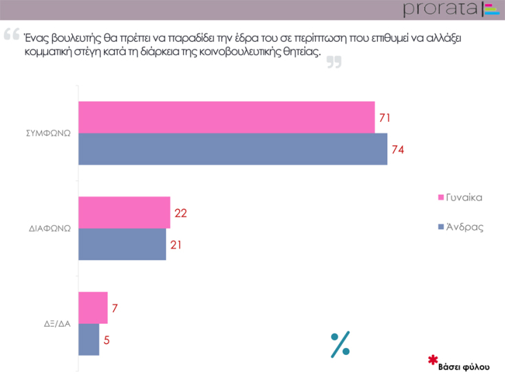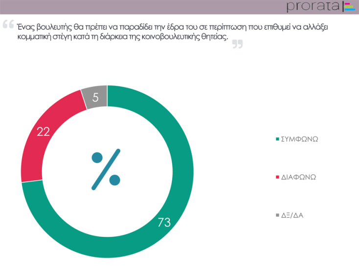 Η Ερώτηση της Εβδομάδας από την Prorata έθεσε το ερώτημα στους εγγεγραμμένους στη λίστα των online ερευνών της και έλαβε μια μάλλον καθαρή απάντηση: το 73% των ατόμων που συμμετείχαν απάντησαν ότι ένας βουλευτής θα πρέπει να παραδίδει την έδρα του σε περίπτωση που επιθυμεί να αλλάξει κομματική στέγη κατά τη διάρκεια κοινοβουλευτικής θητείας, ενώ μόλις το 22% διαφώνησε με την άποψη αυτή.