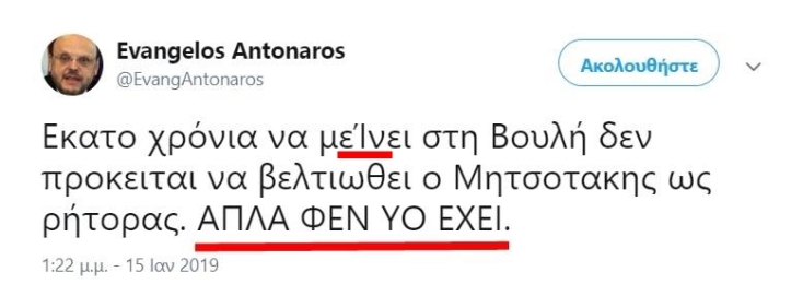 Αυτό προφανώς και δεν το βρίσκω περίεργο και καμία σχέση δεν έχει με την έκκληση για βοήθεια για αυτόν τον Νέστωρα (μτφ. ηλικιωμένος συμπολίτης ανεξαρτήτως ικανοτήτων ή διαύγειας) της πολιτικής. Αυτό που με ανησυχεί είναι τα όλο και πιο συχνά ρεταρίσματα που παρουσιάζονται στον γραπτό λόγο του Ευάγγελου.