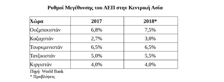 Πολύ σημαντική χώρα είναι και το Ουζμπεκιστάν, το οποίο έχει τον μεγαλύτερο πληθυσμό και κεντρική θέση στο μωσαϊκό της περιοχής. Επιπροσθέτως, τα πρόσφατα πολιτικά ανοίγματα που επιχειρούνται από τον νέο πρόεδρο Mirziyoyev έχουν καταστήσει την χώρα ελκυστική για ξένες επενδύσεις και το Ουζμπεκιστάν εμφανίζει τους υψηλότερους ρυθμούς ανάπτυξης στην Κεντρική Ασία.