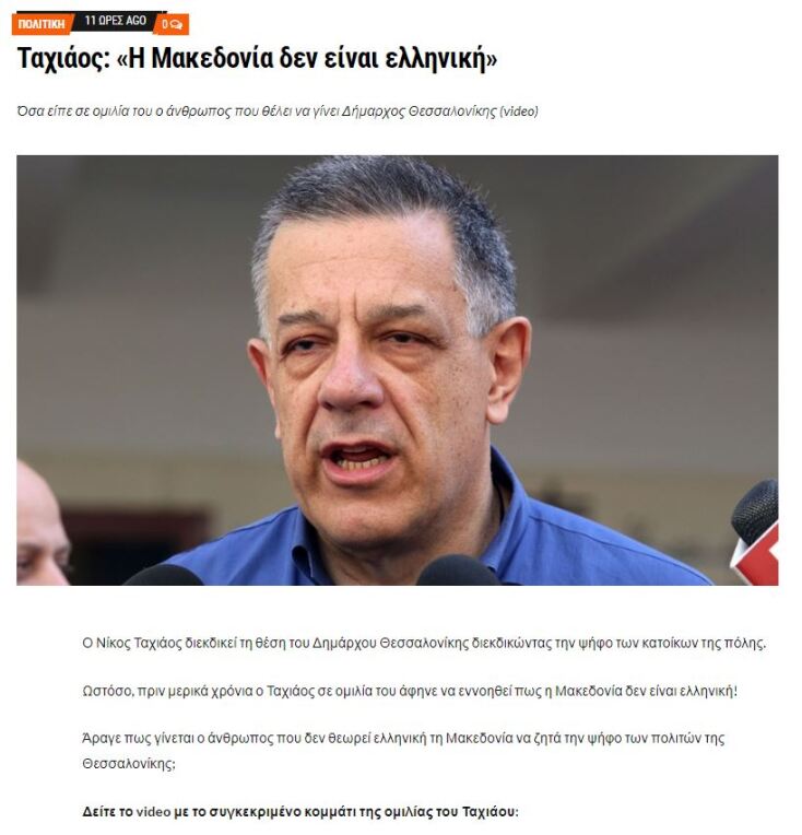 Δημοσίευμα ισχυρίζεται ότι ο υποψήφιος δήμαρχος Θεσσαλονίκης, Νίκος Ταχιάος, είπε σε ομιλία του πως η «Η Μακεδονία δεν είναι ελληνική». Όμως αυτό δεν ισχύει.