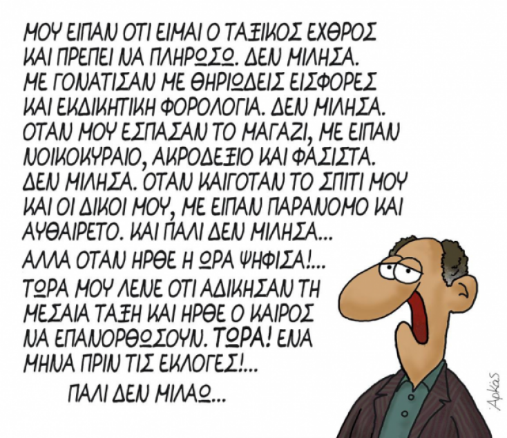 Στο σκίτσο αυτό του Αρκά, λοιπόν, πρωταγωνιστής είναι ένας εκπρόσωπος της μεσαίας τάξης που κάνει έναν, ας πούμε, μικρό απολογισμό για τα χρόνια της τελευταίας διακυβέρνησης, εν όψει εκλογών. Με απάθεια αλλά κι ένα συναίσθημα πικρό, απαριθμεί: Του φέρθηκαν ως ταξικό εχθρό, δεν μίλησε. Τον γονάτισαν με εκδικητική υπερφορολόγηση, δεν μίλησε. Για την κόλαση που βίωσε στο Μάτι, για τους νεκρούς και τη συμφορά που τον βρήκε, του είπαν πως φταίει, ούτε τότε μίλησε. Ψήφισε, όμως, και τότε του είπαν, ένα μήνα πριν τις εκλογές, ότι αδικήθηκε. Το ΤΩΡΑ με κεφαλαία γράμματα ταράζει τον ήρεμο τόνο της αφήγησης και δείχνει τον θυμό. Των ανθρώπων που σε λίγο θα ξαναψηφίσουν.