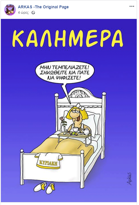 Το δικό του μήνυμα για τις βουλευτικές εκλογές 2019 στέλνει ο Αρκάς μέσω Facebook. Στην επίσημη σελίδα του αναδημοσιεύτηκε το σκίτσο με την «Κυριακή», η οποία παίρνει πρωινό στο κρεβάτι και καλεί τους πολίτες να πάνε να ψηφίσουν. Το συγκεκριμένο σκίτσο είχε δημοσιευτεί ανήμερα του επαναληπτικού γύρου των Αυτοδιοικητικών 2019. «Μην τεμπελιάζετε! Σηκωθείτε να πάτε να ψηφίσετε!» αναφέρει με νόημα η «Κυριακή», στέλνοντας το μήνυμα για μαζική προσέλευση στις κάλπες.