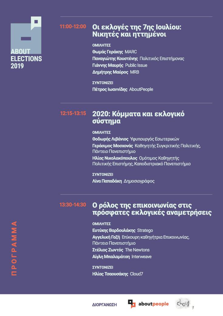 2019: Οι πρώτες εκλογές μετά το Μνημόνιο-Μια πρώτη αποτίμηση για τα αποτελέσματα στην εκδήλωση που διοργανώνουν aboutpeople και Cloud7