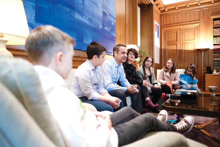 Πέμπτη, 12.00 το μεσημέρι. Ο Κυριάκος Μητσοτάκης βρίσκεται στο γραφείο του. Λίγο πριν η διευθύντρια επικοινωνίας - passpartout, Κύρα Κάπη, και η γραμματέας ποιότητας ζωής και εθελοντισμού της ΝΔ, Πίστη Κρυσταλλίδου, τον είχαν ενημερώσει για τις ιστορίες καθενός από τα παιδιά που θα περνούσαν μετά από λίγη ώρα την πύλη του Μεγάρου Μαξίμου. Η αλήθεια είναι πως όταν λίγες μέρες πριν μου πρότειναν να είμαι η μόνη δημοσιογράφος που θα κάλυπτε τη συνάντηση με τα παιδιά και να μπω κι εγώ μέσα, ένιωσα λίγο περίεργα. Ένα τόσο ευαίσθητο θέμα πώς να το χειριστείς αμιγώς δημοσιογραφικά, σκεφτόμουν. Το ασανσέρ σταματάει στον 1ο. Είναι ο όροφος όπου βρίσκεται η αίθουσα συσκέψεων, ο χώρος όπου συνεδριάζει το υπουργικό συμβούλιο, το γραφείο του διευθυντή του πρωθυπουργού, Γρηγόρη Δημητριάδη, και το γραφείο του Κυριάκου Μητσοτάκη. Διασχίζω τον διάδρομο και γρήγορα διαπιστώνω ότι η ευφορία που επικρατούσε ήταν ασυνήθιστη για το πάντα αθόρυβο κτίριο της Ηρώδου Αττικού. Βλέπω μπροστά μου την Κύρα, που μαζί με τους ακούραστους Δημήτρη Παπαμήτσο και Αλέξη Παπαχρήστο (ο φωτογράφος και ο καμεραμάν του πρωθυπουργού) μιλούσαν γλυκά στα πιτσιρίκια που είχαν έρθει για τη συνάντηση. Λίγο πιο πέρα ο Κώστας Μπαρδάκας μαζί με τον Άγγελο Ηλία, οι φύλακες- άγγελοι του Μαξίμου που φροντίζουν για κάθε τεχνική λεπτομέρεια, παίζουν με κάποια από τα παιδιά και σιγά-σιγά όλοι μαζί αρχίζουμε να γινόμαστε μια παρέα που γελάει δυνατά. Άρχισα να αναρωτιέμαι πώς γίνεται αυτά τα παιδιά να έχουν περάσει μια τόσο δύσκολη περιπέτεια και τίποτα απολύτως να μην έχει «γράψει» στα προσωπάκια τους. Άραγε να συμβαίνει το ίδιο και με την ψυχή τους; Θα το διαπίστωνα λίγη ώρα μετά.
