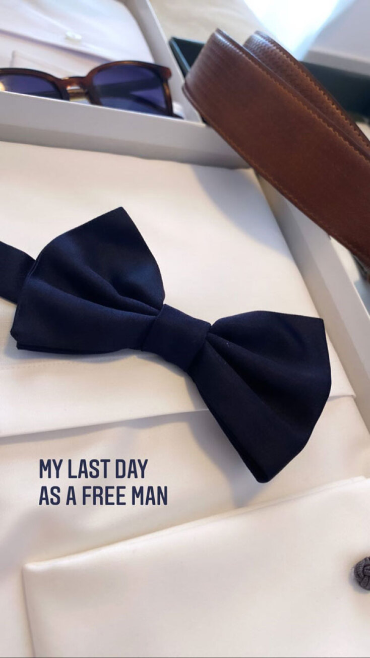 Και ο ίδιος ανέβασε Instastory με ένα στιγμιότυπο από την προετοιμασία πριν κατευθυνθεί στην εκκλησία, γράφοντας «η τελευταία μου ημέρα ως ελεύθερος», αλλά και μια φωτογραφία ως παντρεμένος πια με την ανατολή από το όμορφο νησί του Αιγαίου.