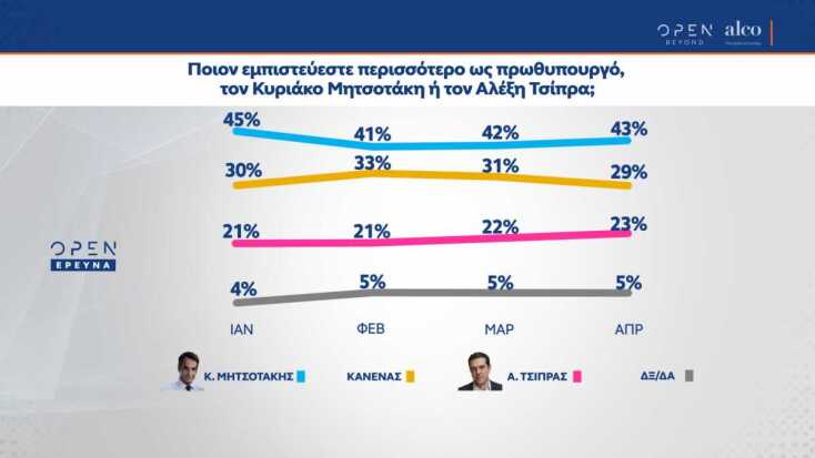 Στο ερώτημα ποιον εμπιστεύεστε περισσότερο ως πρωθυπουργό, ο Κυριάκος Μητσοτάκης συγκεντρώνει 43%, ο «κανένας» 29%, ο Αλέξης Τσίπρας 23%.