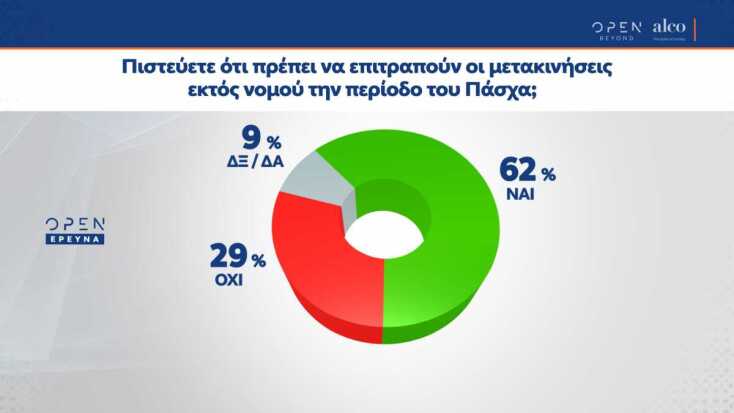 Οι πολίτες, σύμφωνα με τα ευρήματα της δημοσκόπησης λένε «Ναι» στο άνοιγμα των διαπεριφερειακών μετακινήσεων το Πάσχα, κάτι που αναμένεται να αποφασιστεί μέσα στις επόμενες ημέρες. Αν και φαίνεται ότι οι εισηγήσεις των ειδικών είναι αρνητικές.