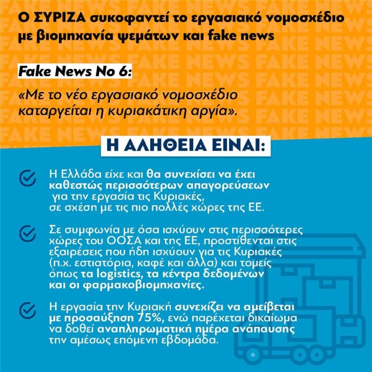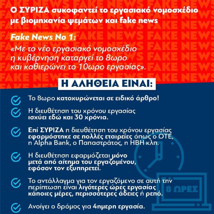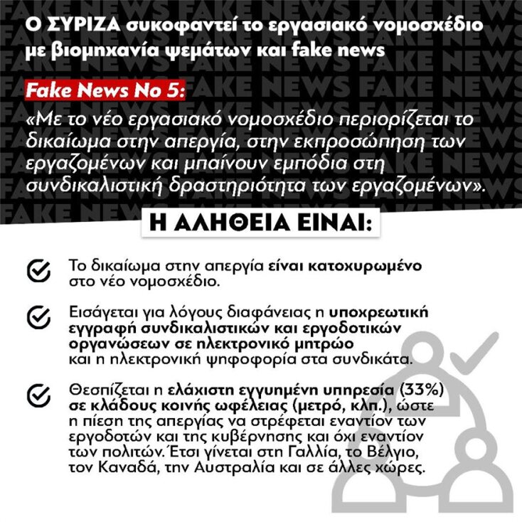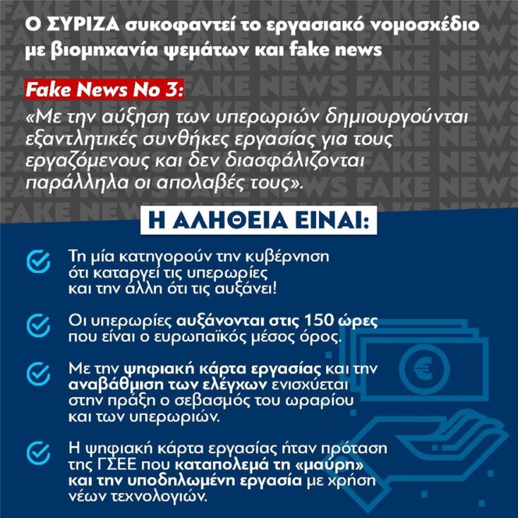 Ο ΣΥΡΙΖΑ, αντί να επιλέξει να κάνει κριτική επί υπαρκτών ρυθμίσεων και να προτείνει τις δικές του, κάνει αντιπολίτευση με FAKE NEWS. Αναπαράγει ρυθμίσεις που υπάρχουν μόνο στη φαντασία του και κωμικά επιχειρήματα περί ανάλγητης κυβέρνησης, σαν να έχει πάρει εργολαβικά το δικαίωμα της υπεράσπισης των εργαζομένων και να έχει το μονοπώλιο της κοινωνικής ευαισθησίας.