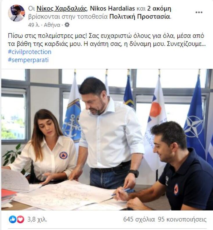 «Πίσω στις πολεμίστρες μας!», έγραψε χαρακτηριστικά ο κ. Χαρδαλιάς