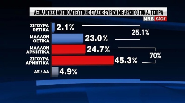 Ακόμη μεγαλύτερη είναι όμως η αρνητική αξιολόγηση της αντιπολιτευτικής στάσης του ΣΥΡΙΖΑ, με αρχηγό της αξιωματικής αντιπολίτευσης τον Αλέξη Τσίπρα. Συγκεκριμένα, το 70% του συνόλου των ερωτηθέντων αξιολογεί την αντιπολιτευτική στάση του ΣΥΡΙΖΑ αρνητικά ή μάλλον αρνητικά, έναντι 25,1% την αξιολογεί θετικά ή μάλλον θετικά.