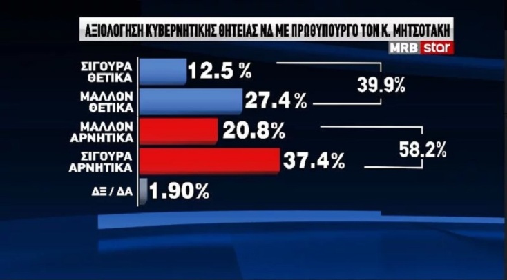 Για την αξιολόγηση της κυβερνητικής θητείας της ΝΔ, με πρωθυπουργό τον Κυριάκο Μητσοτάκη, το 39,9% του συνόλου των ερωτηθέντων απαντά ότι την αξιολογεί σίγουρα ή μάλλον θετικά και το 58,2% σίγουρα ή μάλλον αρνητικά.