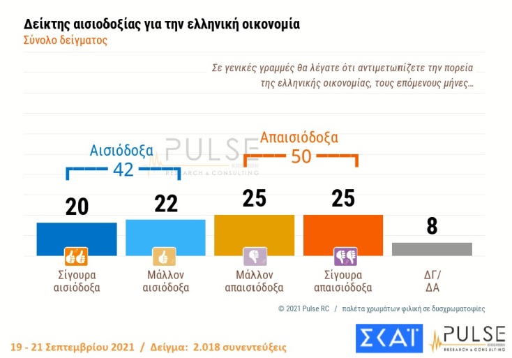 Όσον αφορά το δείκτη αισιοδοξίας για την πορεία της οικονομίας το 42% των ερωτώμενων συνολικά δηλώνουν σίγουρα αισιόδοξοι (22%) ή μάλλον αισιόδοξοι (20%), ενώ το 50% συνολικά αισθάνονται σίγουρα (25%) αισιόδοξοι ή μάλλον απαισιόδοξοι (25%).