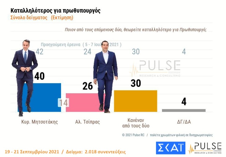 Καταλληλότερος για πρωθυπουργός ο Κυριάκος Μητσοτάκης που προηγείται με 14 μονάδες του Αλέξη Τσίπρα (40% και 26% αντίστοιχα). Στην προηγούμενη έρευνα της PULSE (5-7 Ιουλίου) τα ποσοστά ήταν 42% και 24%.
