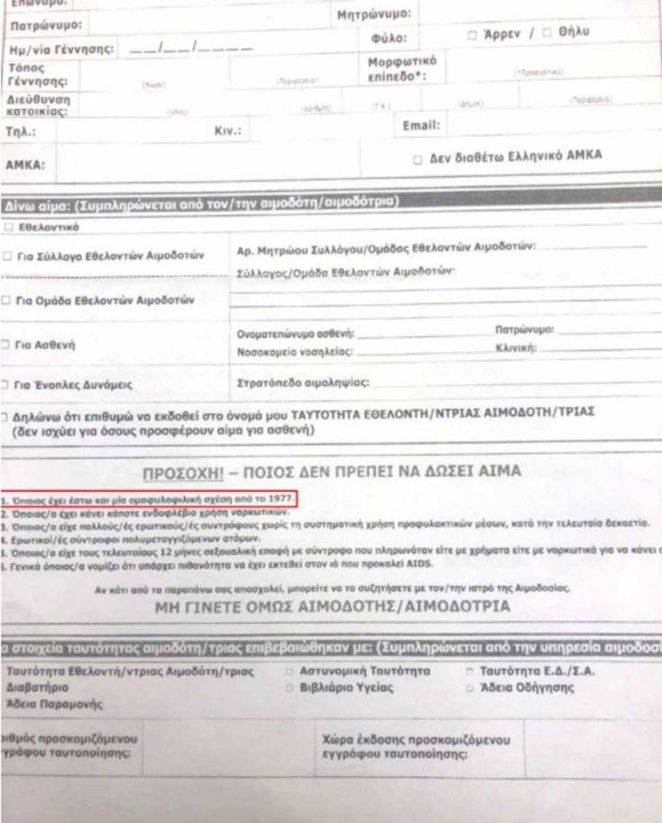 Το έγγραφο του Κέντρου Αιμοδοσίας για τις ομοφυλοφιλικές σχέσεις