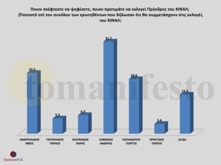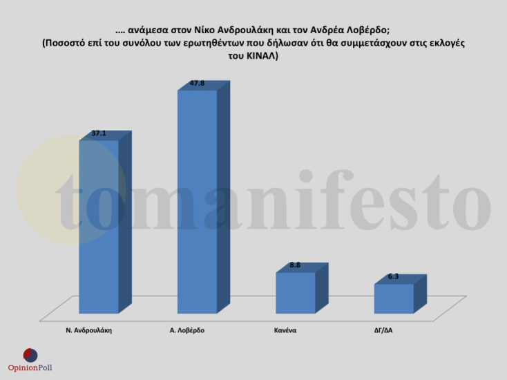 Ισχυρό προβάδισμα των Ανδρέα Λοβέρδου και Νίκου Ανδρουλάκη καταγράφεται σε δημοσκόπηση της Opinion Poll σχεδόν τριάντα ημέρες πριν τις εκλογές στο ΚΙΝΑΛ.