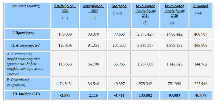 Όσον αφορά στο Δεκέμβριο 2021, το ισοζύγιο ροών μισθωτής απασχόλησης ήταν ελαφρά αρνητικό -κατά 2.598 θέσεις εργασίας-, αφού οι αναγγελίες πρόσληψης ανήλθαν σε 193.008, ενώ οι αποχωρήσεις σε 195.606 (76.943 οικειοθελείς αποχωρήσεις και 118.663 καταγγελίες συμβάσεων αορίστου χρόνου ή λήξεις συμβάσεων ορισμένου χρόνου).