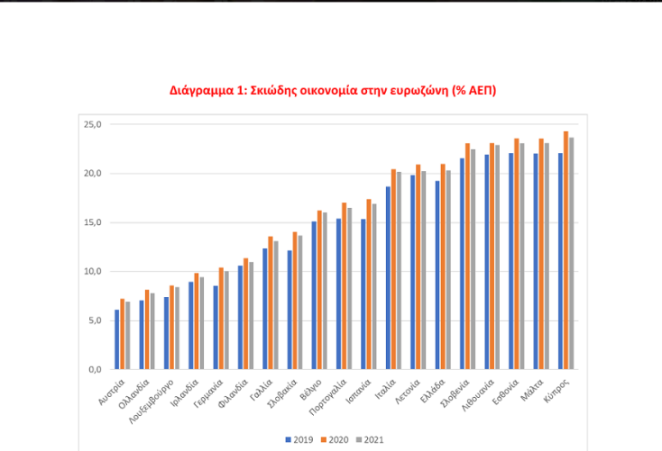 Στην Ελλάδα, η σκιώδης οικονομία υπολογίζεται πως αυξήθηκε πρόπερσι στο 20,9% του ΑΕΠ, έναντι 19,23% το 2019, με την εκτίμηση για το 2021 να είναι ότι υποχώρησε εκ νέου, στο 20,3%, σύμφωνα πάντα με τον κ. Σνάιντερ.