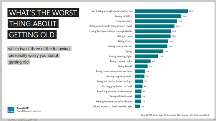 Σε κάθε περίπτωση και πέρα από τις όποιες προτεραιότητες και τις ανησυχίες που έχει ο καθένας για τη μεγάλη ηλικία, το σημαντικότερο εύρημα των ερευνών είναι ότι εκείνοι που την αντιμετωπίζουν πιο αισιόδοξα φαίνεται να ζουν κατά μέσο όρο 7,5 χρόνια περισσότερο από εκείνους που στέκονται με φόβο και απαξίωση μπροστά στα γηρατειά. (Ipsos, The Perennials, 2019)