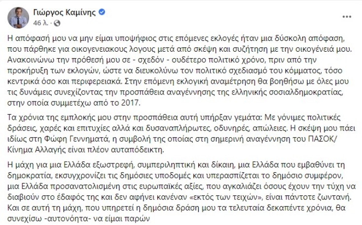 «Η απόφασή μου να μην είμαι υποψήφιος στις επόμενες εκλογές ήταν μια δύσκολη απόφαση, που πάρθηκε για οικογενειακους λογους μετά από σκέψη και συζήτηση με την οικογένειά μου. Ανακοινώνω την πρόθεσή μου σε - σχεδόν - ουδέτερο πολιτικό χρόνο, πριν από την προκήρυξη των εκλογών, ώστε να διευκολύνω τον πολιτικό σχεδιασμό του κόμματος, τόσο κεντρικά όσο και περιφερειακά. Στην επόμενη εκλογική αναμέτρηση θα βοηθήσω με όλες μου τις δυνάμεις συνεχίζοντας την προσπάθεια αναγέννησης της ελληνικής σοσιαλδημοκρατίας, στην οποία συμμετέχω από το 2017.