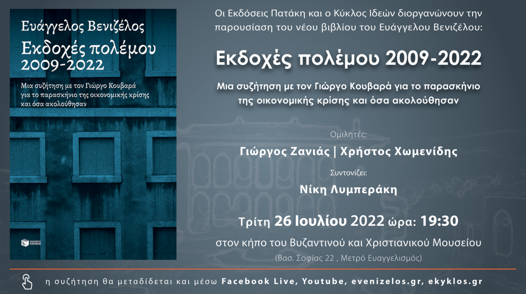 Οι εκδόσεις Πατάκη και ο Κύκλος Ιδεών σας προσκαλούν στην παρουσίαση του νέου βιβλίου του Ευάγγελου Βενιζέλου, «Εκδοχές πολέμου 2009-2022. Μια συζήτηση με τον Γιώργο Κουβαρά για το παρασκήνιο της οικονομικής κρίσης και όσα ακολούθησαν».