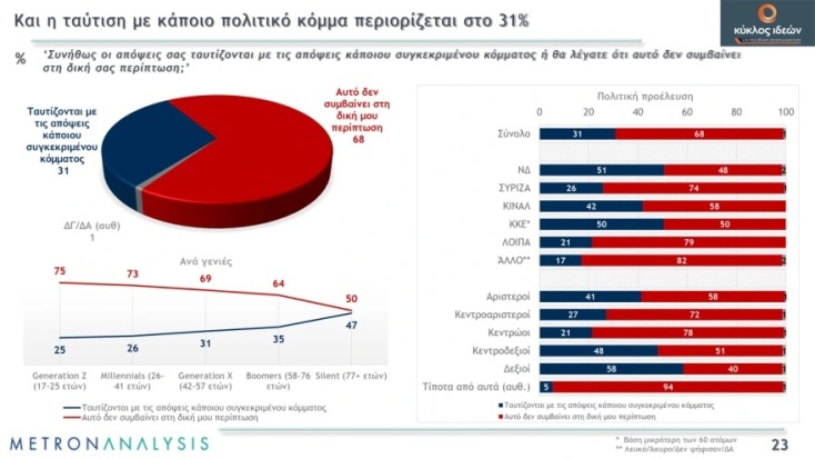 Άλλη «κάρτα» της έρευνας δείχνει ότι η κομματική εμπιστοσύνη κινείται σε χαμηλά επίπεδα: η μέση τιμή σημειώνεται στο 3,8, στην κλίμακα από το μηδέν μέχρι το 10. Μόλις το 31% δηλώνει ότι οι απόψεις του ταυτίζονται με αυτές κάποιου κόμματος- «αυτό δεν συμβαίνει στη δική μου περίπτωση», απαντά το 68%.