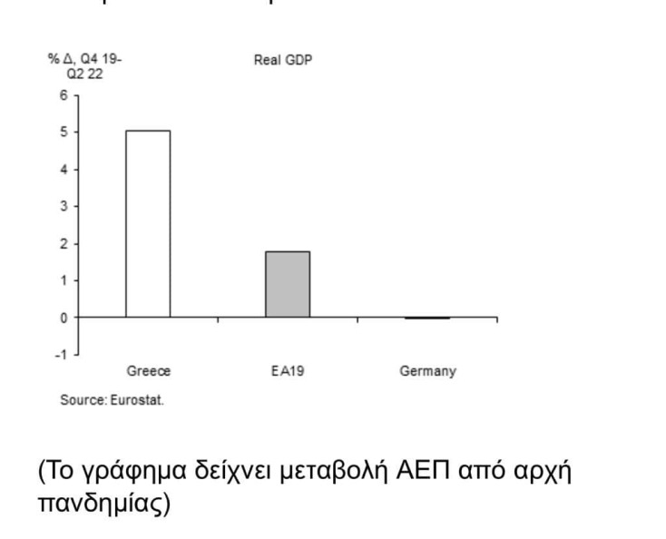 «Στο πρώτο γράφημα απεικονίζεται η μεγέθυνση του εθνικού εισοδήματος από το τελευταίο τρίμηνο του 2019 έως το πρώτο εξάμηνο του 2022. Παρά την παγκόσμια και εθνική ύφεση που προκάλεσαν η πανδημία και τα lockdown, η ελληνική οικονομία κατάφερε να μεγεθυνθεί σωρευτικά τους τελευταίους 33 μήνες κατά 5 μονάδες. Σύμφωνα με το προσχέδιο του προϋπολογισμού του 2023 που κατατέθηκε αυτή την εβδομάδα στη Βουλή, το ΑΕΠ εκτιμάται ότι θα φτάσει τα 210 δισ. ευρώ το 2022 από 183 δισ. ευρώ το 2019. Την ίδια περίοδο η ευρωζώνη παρουσιάζει υποδιπλάσιο ρυθμό ανάπτυξης, η δε Γερμανία σχεδόν μηδενικό», αναφέρει στην ανάρτησή του ο Άκης Σκέρτσος.