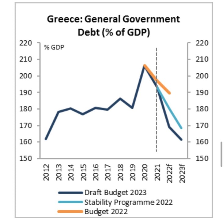 Σχετικά με το δεύτερο γράφημα, ο υπουργός Επικρατείας γράφει: «απεικονίζεται η ραγδαία αποκλιμάκωση του δημοσίου χρέους μετά την πρόσκαιρη αύξησή του 2020 όταν το κράτος έγινε αναπόφευκτα ο εργοδότης σχεδόν όλης της οικονομίας κατά τη διάρκεια των lockdown. Και πάλι σύμφωνα με το προσχέδιο του προϋπολογισμού του 2023, το χρέος της Γενικής Κυβέρνησης εκτιμάται ότι θα διαμορφωθεί στα 355.000 εκατ. ευρώ ή 169,1% ως ποσοστό του ΑΕΠ στο τέλος του 2022, έναντι 353.389 εκατ. ευρώ ή 193,3% ως ποσοστό του ΑΕΠ το 2021, παρουσιάζοντας μείωση κατά 24,2 (!!!) ποσοστιαίες μονάδες έναντι του 2021. Το 2023, το χρέος της Γενικής Κυβέρνησης προβλέπεται ότι θα διαμορφωθεί στα 357.000 εκατ. ευρώ ή 161,6% ως ποσοστό του ΑΕΠ, παρουσιάζοντας περαιτέρω μείωση κατά 7,5 ποσοστιαίες μονάδες του ΑΕΠ έναντι του 2021. Πρακτικά μιλάμε για την ταχύτερη μείωση δημοσίου χρέους στην ΕΕ και αυτό σε συνθήκες αναγκαστικής δημοσιονομικής επέκτασης».