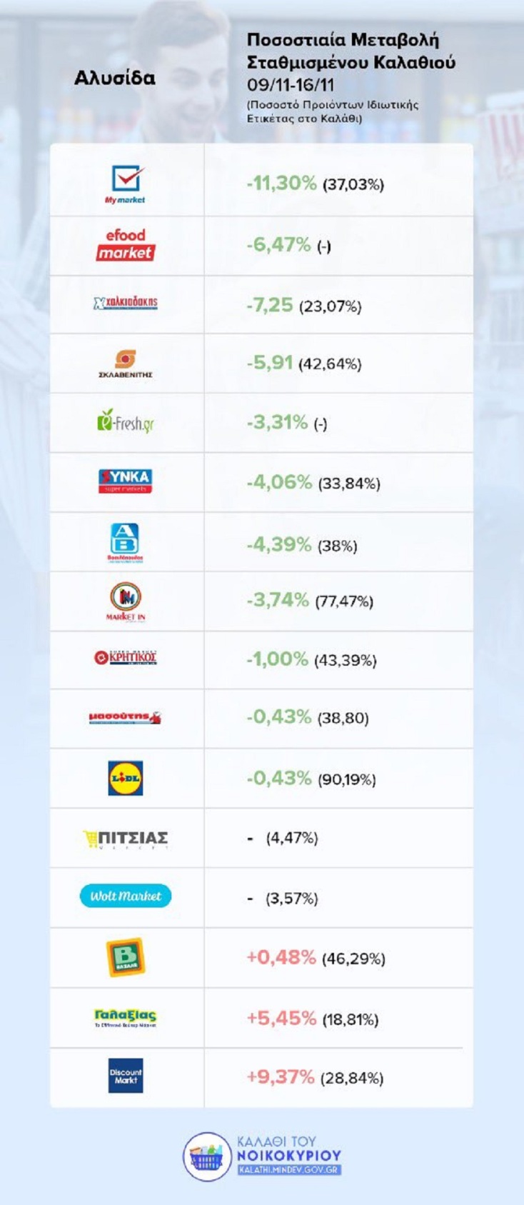 - Ως εκ τούτου, το συνολικό κόστος του «καλαθιού του νοικοκυριού» είναι αισθητά μειωμένο στις περισσότερες αλυσίδες σούπερ μάρκετ με τη μεγαλύτερη μείωση -11,3% στην αλυσίδα My market.