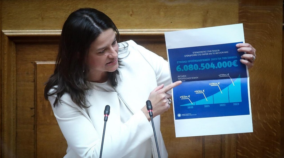 «Για το 2023, η στόχευσή μας είναι διπλή: Περισσότερα χρήματα με αποτελεσματικότερη απορρόφηση, ποιοτικότερη κατανομή με πολλαπλασιαστικά οφέλη στην κοινωνία». Αυτό τόνισε η υπουργός Παιδείας, Νίκη Κεραμέως, κατά τη συζήτηση του κρατικού προϋπολογισμού για το 2023, στην Ολομέλειας της Βουλής, δίνοντας έμφαση στην αύξηση των κονδυλίων για την Παιδεία κατά 239 εκατ. ευρώ.