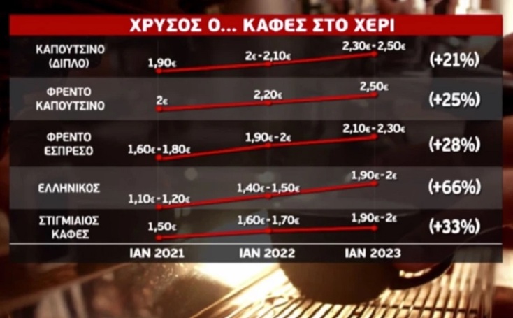 Μάλιστα, σύμφωνα με το ρεπορτάζ του MEGA, ή όπως δείχνουν τα στοιχεία, ένας εργαζόμενος - φοιτητής για δύο καφέδες την ημέρα, freddo espresso, πλήρωνε το 2021 64 ευρώ, το 2022 76 ευρώ και το 2023 84 ευρώ, αύξηση δηλαδή 20€/μηνιαίως μέσα σε 2 χρόνια.