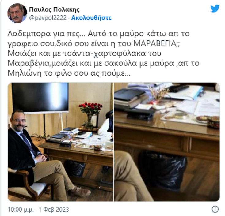 Πιο συγκεκριμένα, ο Παύλος Πολάκης ανάρτησε στο Twitter δύο στιγμιότυπα από συνάντηση του Άδωνι Γερωγιάδη με τον Κώστα Μαραβέγια, όπου ξεχωρίζει μια μαύρη σακούλα κάτω από το γραφείο, γράφοντας: «Λαδέμπορα για πες… Αυτό το μαύρο κάτω απ το γραφείο σου, δικό σου είναι ή του ΜΑΡΑΒΕΓΙΑ;; Μοιάζει και με τσάντα-χαρτοφύλακα του Μαραβέγια, μοιάζει και με σακούλα με μαύρα, απ' τον Μηλιώνη τον φίλο σου ας πούμε…».