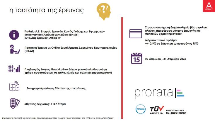 Προβάδισμα τεσσάρων ποσοστιαίων μονάδων της ΝΔ έναντι του ΣΥΡΙΖΑ καταγράφει η δημοσκόπηση της εταιρείας Prorata για τον τηλεοπτικό σταθμό Attica, ενόψει της εκλογικής αναμέτρησης της 21ης Μαΐου. Στην πρόθεση ψήφου, σε σύγκριση με την προηγούμενη δημοσκόπηση της Prorata, η «ψαλίδα» μεταξύ κυβερνώντος κόμματος και αξιωματικής αντιπολίτευσης ανοίγει κατά 1,5 μονάδα.