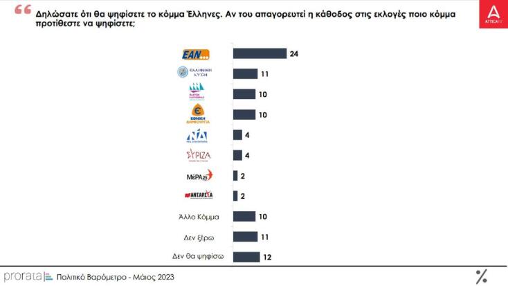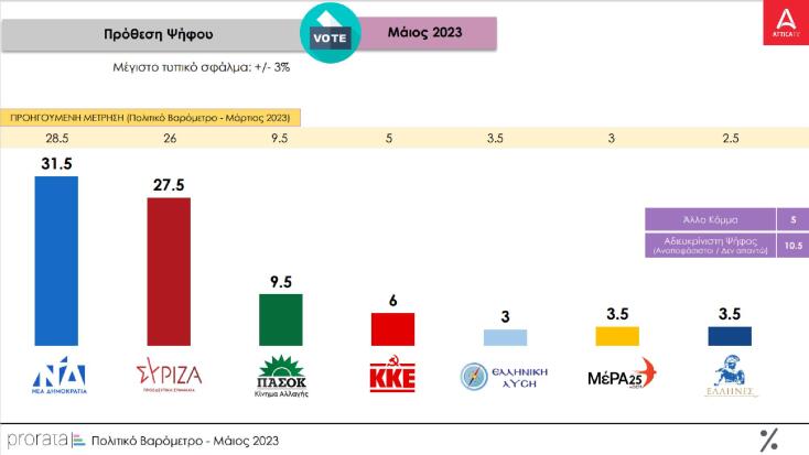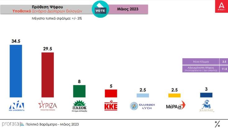 Συγκεκριμένα, στην πρόθεση ψήφου, το κυβερνών κόμμα συγκεντρώνει 34,5% και η αξιωματική αντιπολίτευση 29,5%), ενώ το ΠΑΣΟΚ συμπιέζεται στο 8% με το ΜέΡΑ25 και την Ελληνική Λύση να μένουν εκτός Βουλής. Το ποσοστό της αδιευκρίνιστης ψήφου ενισχύεται περαιτέρω και αυξάνεται στο 11,5%.