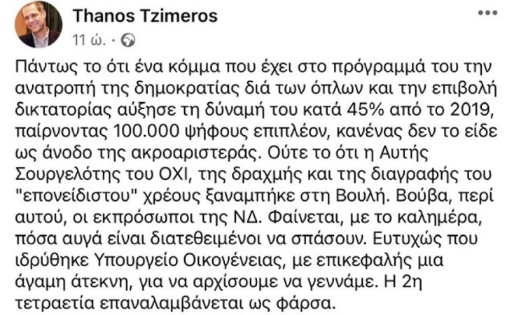 «Ευτυχώς που ιδρύθηκε Υπουργείο Οικογένειας, με επικεφαλής μια άγαμη άτεκνη, για να αρχίσουμε να γεννάμε. Η 2η τετραετία επαναλαμβάνεται ως φάρσα», έγραψε αρχικά ο Θάνος Τζήμερος, προκαλώντας σφοδρές αντιδράσεις.