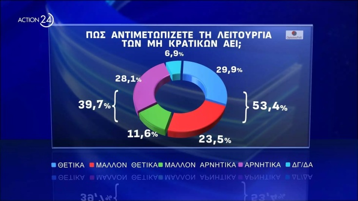 Για τη λειτουργία των μη κρατικών ΑΕΙ το 53,4% το κρίνει θετικά ή μάλλον θετικά ενώ το 39,7% αρνητικά ή μάλλον αρνητικά, ενώ το 6,9% λέει δεν ξέρω/δεν απαντώ.