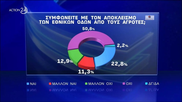 Στο αν συμφωνείτε με τον αποκλεισμό των εθνικών οδών από τους αγρότες το 50,8% λέει όχι, το 22,8% ναι, το 12,9% μάλλον όχι και το 11,3% μάλλον ναι.