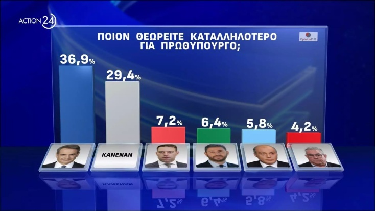 Στην ερώτηση για το ποιον θεωρείτε καταλληλότερο για πρωθυπουργό ο Κυριάκος Μητσοτάκης προηγείται με 36,9%, ακολουθεί ο κανένας με 29,4% και τρίτος είναι ο Στέφανος Κασσελάκης με 7,2%.