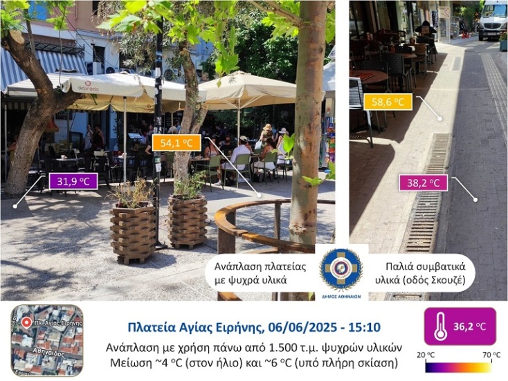 Δήμος Αθηναίων: Αντίστοιχες παρεμβάσεις εφαρμόζονται και σε άλλους δημόσιους χώρους της Αθήνας, όπως η Πλατεία Αγίας Ειρήνης και η Πλατεία Καρύτση, με τη χρήση ψυχρών υλικών