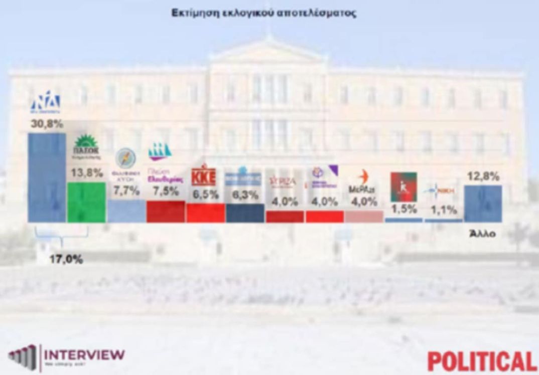 Στη τελευταία δημοσκόπηση της εταιρείας Interview για την εφημερίδα Political, η Νέα Δημοκρατία καταγράφει 30,8% στην εκτίμηση εκλογικού αποτελέσματος, ενώ το ΠΑΣΟΚ βρίσκεται 17 μονάδες πίσω, στο 13,8%. Ακολουθούν η Ελληνική Λύση που σημειώνει 7,7%, η Πλεύση Ελευθερίας 7,5%, το ΚΚΕ 6,5% και η Φωνή Λογικής 6,3%. Ο ΣΥΡΙΖΑ περιορίζεται στο 4%, το Κίνημα Δημοκρατίας στο 4%, το ΜέΡΑ25 επίσης στο 4%, η Νέα Αριστερά στο 1,5% και η Νίκη στο 1,1%, ενώ το «άλλο» συγκεντρώνει 12,8%.