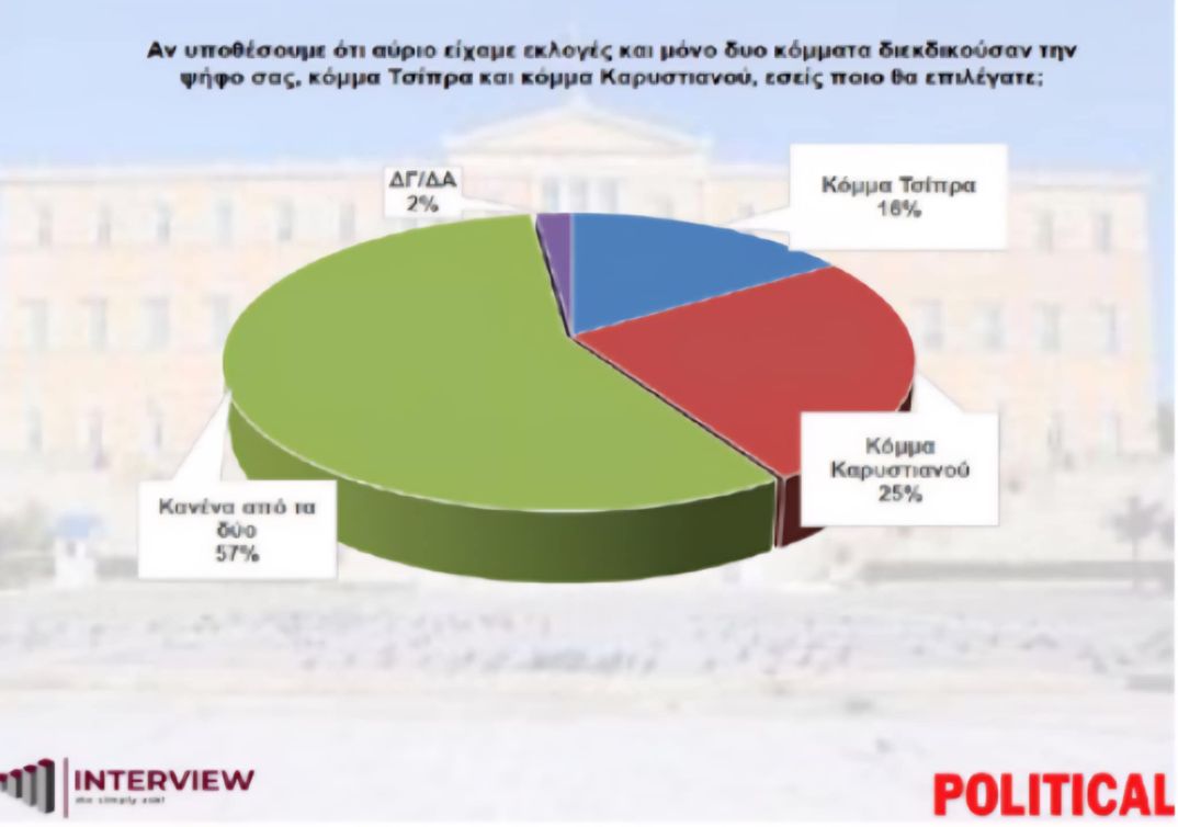 Στο υποθετικό ερώτημα «κόμμα Τσίπρα ή κόμμα Καρυστιανού», το 57% δεν επιλέγει κανένα από τα δύο. Από όσους απαντούν, το 25% προτιμά το κόμμα Καρυστιανού και το 16% το κόμμα Τσίπρα.