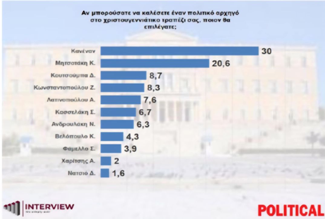Στο ιδιαίτερο ερώτημα «ποιον πολιτικό θα καλούσατε στο χριστουγεννιάτικο τραπέζι», ο «κανένας» προηγείται με 30%. Ακολουθεί ο Κυριάκος Μητσοτάκης με 20,6%, ο Δημήτρης Κουτσούμπας με 8,7%, η Ζωή Κωνσταντοπούλου με 8,3%, η Αφροδίτη Λατινοπούλου με 7,6%, ο Στέφανος Κασσελάκης με 6,7%, ο Νίκος Ανδρουλάκης με 6,3%, ο Κυριάκος Βελόπουλος με 4,3%, ο Σωκράτης Φάμελλος με 3,9%, ο Αλέξης Χαρίτσης με 2% και ο Δημήτρης Νατσιός με 1,6%.