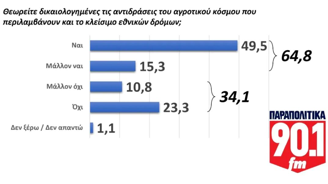 Ιδιαίτερο ενδιαφέρον παρουσιάζουν τα ευρήματα για τις αγροτικές κινητοποιήσεις. Το 85,1% θεωρεί δίκαια τα αιτήματα των αγροτών, ενώ το 64,8% δικαιολογεί ακόμη και τις μορφές κινητοποιήσεων που περιλαμβάνουν το κλείσιμο εθνικών οδών. Η κοινωνική ανοχή προς τον αγροτικό κόσμο συνδέεται άμεσα με τις αποκαλύψεις γύρω από το σκάνδαλο του ΟΠΕΚΕΠΕ, ενισχύοντας τη νομιμοποίηση των διεκδικήσεών τους.