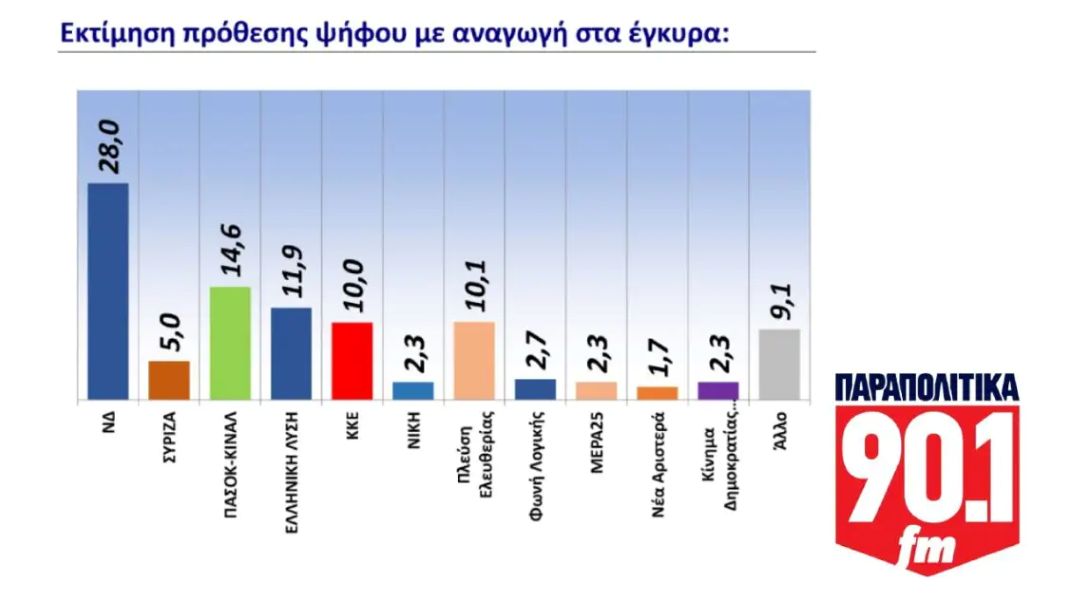 Το συνολικό κλίμα αποτυπώνεται και στις κομματικές επιδόσεις. Η Νέα Δημοκρατία υποχωρεί κατά 1,5 μονάδα και καταγράφεται στο 23,7% στην πρόθεση ψήφου, από 25,2% τον προηγούμενο μήνα. Το ΠΑΣΟΚ ακολουθεί με 12,3% από 12,6%, ενώ η Ελληνική Λύση διατηρείται στην τρίτη θέση με 10,1%. Κερδισμένη εμφανίζεται η Πλεύση Ελευθερίας, η οποία ανεβαίνει στο 8,5% από 5,8% τον Νοέμβριο, επιβεβαιώνοντας τη δυναμική της στο ρευστό πολιτικό σκηνικό. Στην εκτίμηση της πρόθεσης ψήφου, με αναγωγή στα έγκυρα, η Νέα Δημοκρατία λαμβάνει 28%, έναντι του ΠΑΣΟΚ που βρίσκεται στο 14,6%, της Ελληνικής Λύσης που ακολουθεί με 11,9% και έπονται Πλεύση Ελευθερίας με 10,1% και ΚΚΕ με 10%.