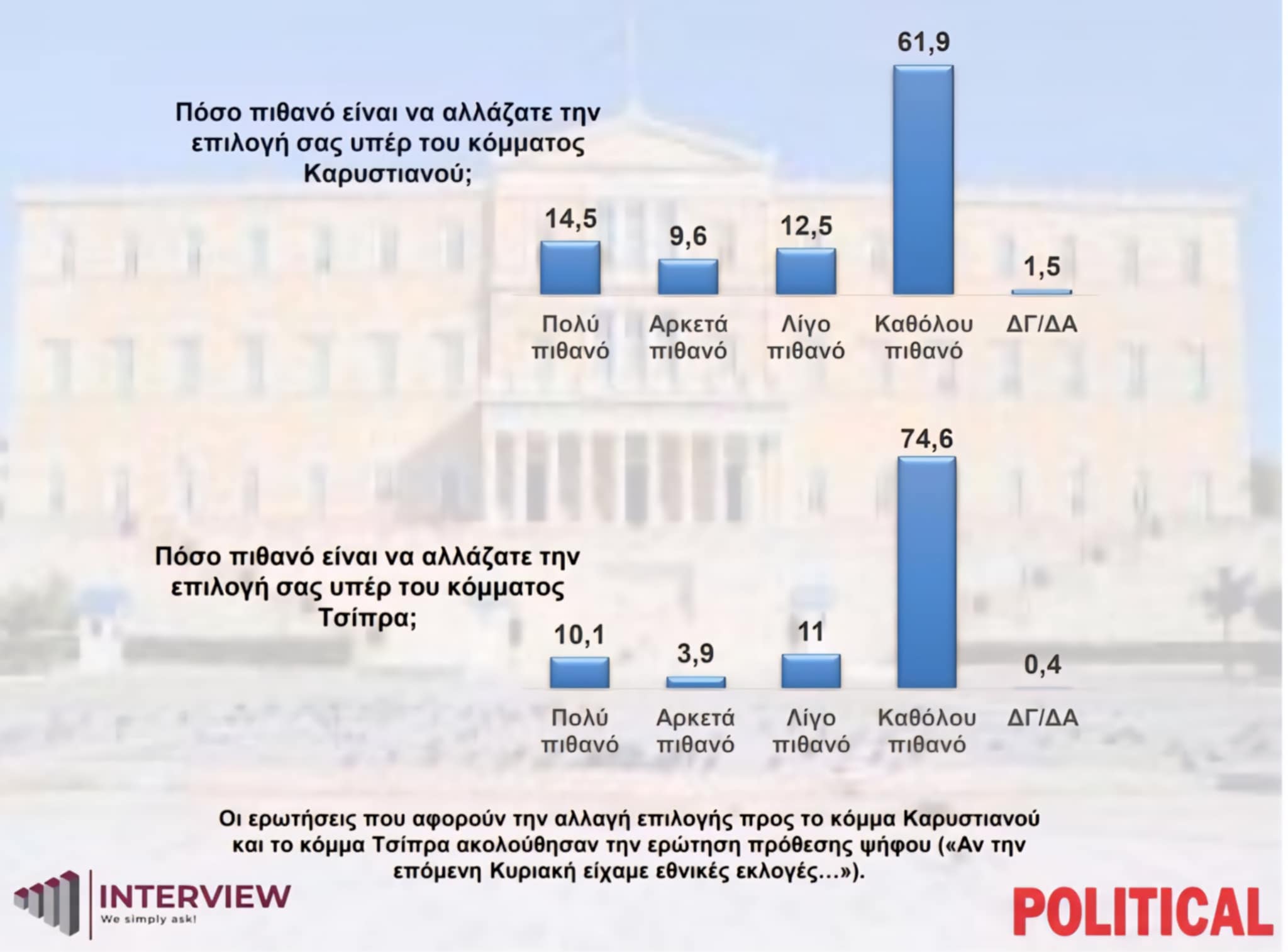 Το 14,5% των ερωτηθέντων δηλώνει ότι θα ήταν «πολύ πιθανό» να αλλάξει επιλογή υπέρ κόμματος υπό τη Μαρία Καρυστιανού, ενώ για κόμμα υπό τον Αλέξης Τσίπρας το αντίστοιχο ποσοστό είναι 10,1%.