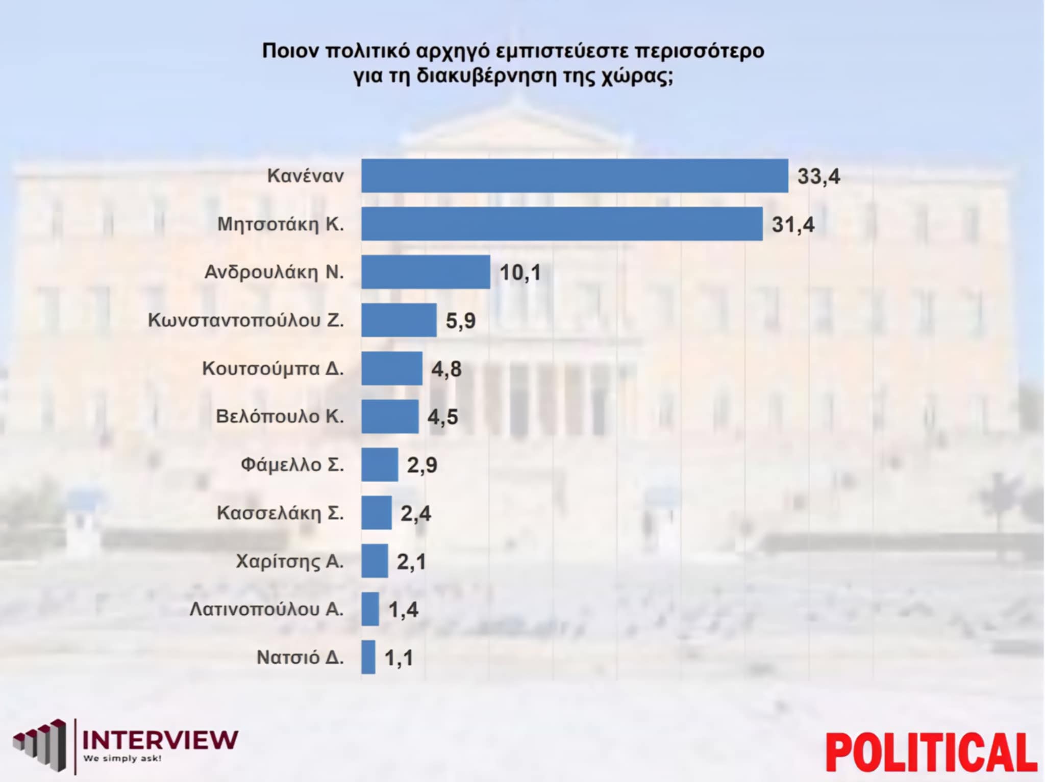 Στο ερώτημα για το ποιον πολιτικό αρχηγό εμπιστεύονται περισσότερο για τη διακυβέρνηση της χώρας, ο Κυριάκος Μητσοτάκης συγκεντρώνει 31,4%, ποσοστό υπερτριπλάσιο από εκείνο του δεύτερου, Νίκος Ανδρουλάκης, που φτάνει το 10,1%. Ακολουθούν η Ζωή Κωνσταντοπούλου (5,9%), ο Δημήτρης Κουτσούμπας (4,8%) και ο Κυριάκος Βελόπουλος (4,5%).