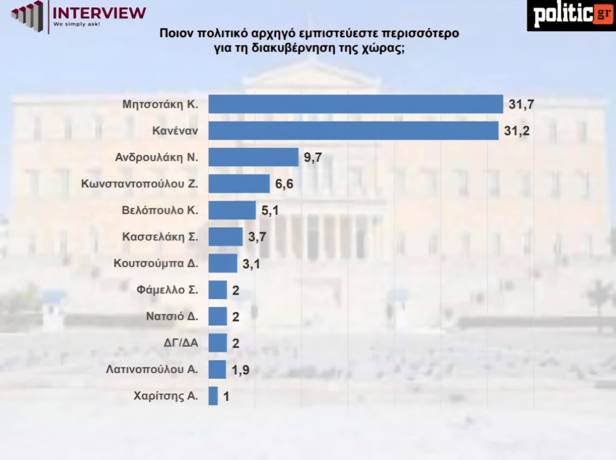 Στο ερώτημα για την εμπιστοσύνη στη διακυβέρνηση της χώρας, πρώτος παραμένει ο Κυριάκος Μητσοτάκης με 31,7%, με την απάντηση «κανένας» να ακολουθεί οριακά στο 31,2%. Ο Νίκος Ανδρουλάκης συγκεντρώνει 9,7%, η Ζωή Κωνσταντοπούλου 6,6% και ο Κυριάκος Βελόπουλος 5,1%. Σε χαμηλότερα ποσοστά βρίσκονται ο Στέφανος Κασσελάκης (3,7%), ο Δημήτρης Κουτσούμπας (3,1%) και ο Σωκράτης Φάμελλος (2%).