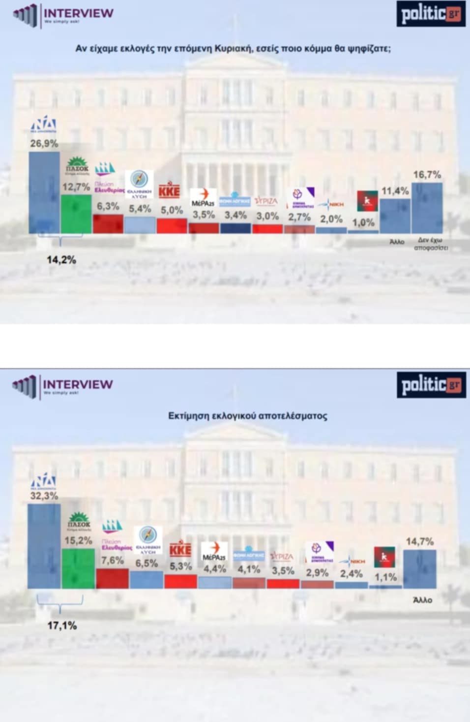 Δημοσκόπηση Interview- Πρόθεση ψήφου: ΝΔ 26,9%, ΠΑΣΟΚ 12,7%, τρίτη η Πλεύση Ελευθερίας