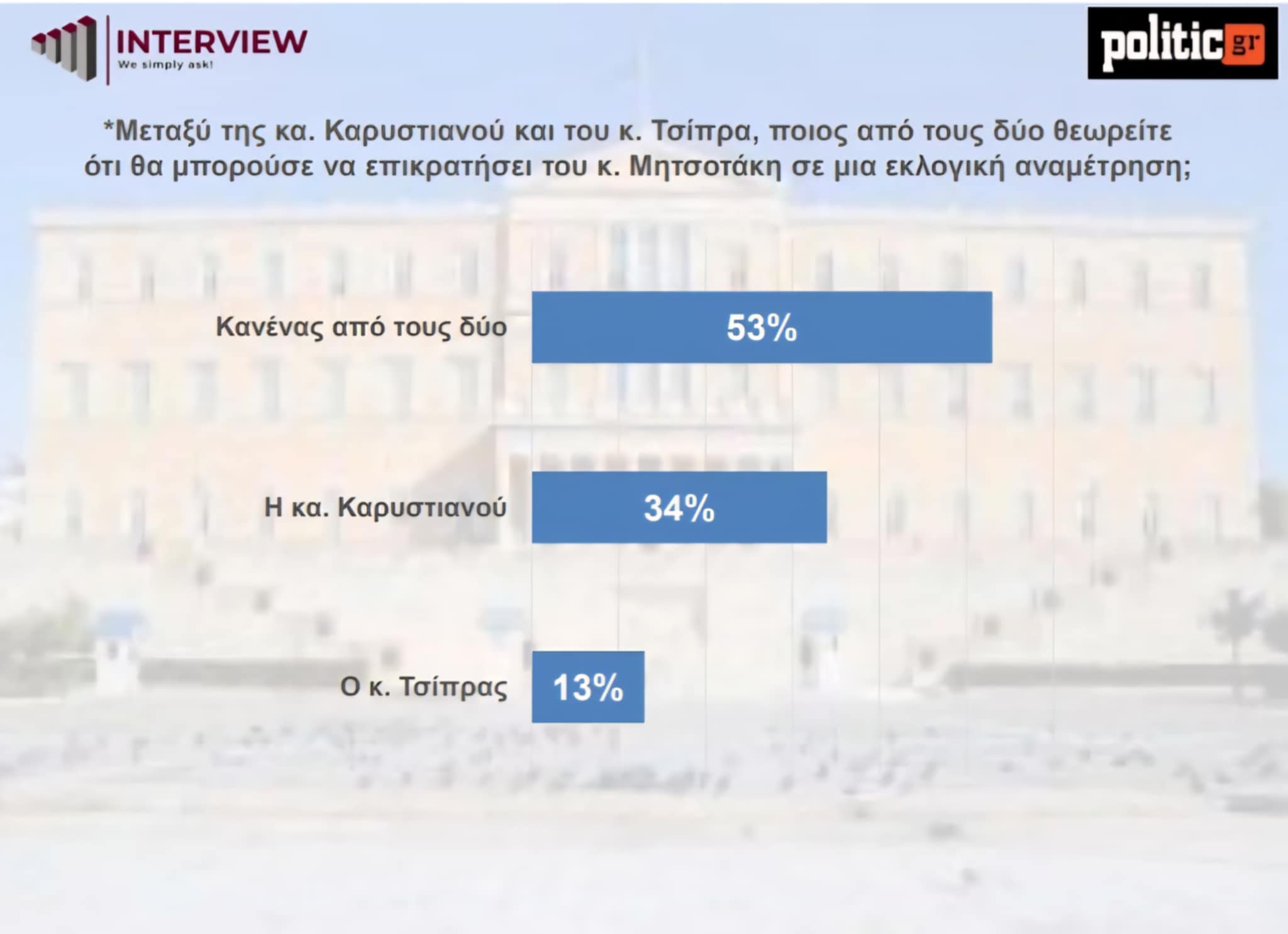 Δημοσκόπηση Interview δείχνει προβάδισμα ΝΔ, δεύτερο ΠΑΣΟΚ, πτώση Καρυστιανού, αδύναμο rebranding Τσίπρα, υψηλό ποσοστό αναποφάσιστων