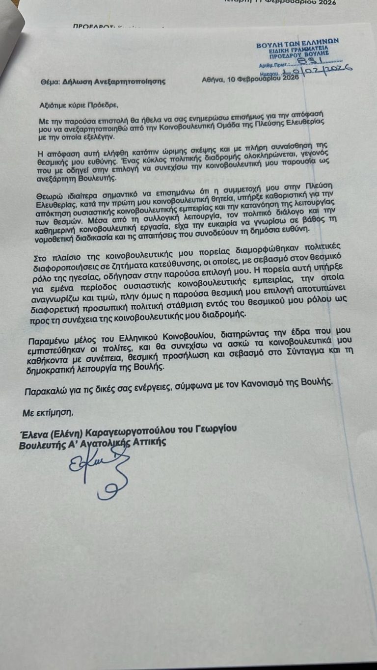 Δόθηκε στη δημοσιότητα η επιστολή ανεξαρτητοποίησης προς τον Πρόεδρο της Βουλής της βουλεύτριας Ανατολικής Αττικής της Πλεύσης Ελευθερίας Έλενας Καραγεωργοπούλου. Η ανεξάρτητη βουλεύτρια, η οποία εξελέγη με το κόμμα της Ζωή Κωνσταντοπούλου, γνωστοποιεί ότι αποχωρεί από την Κοινοβουλευτική Ομάδα, διατηρώντας ωστόσο την έδρα της.