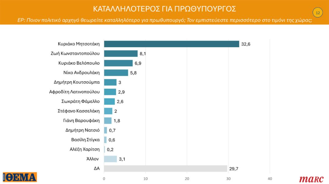 Ο Κυριάκος Μητσοτάκης εμφανίζεται να «παίζει» χωρίς αντίπαλο στην καταλληλότητα για την πρωθυπουργία, καταγράφοντας 32,6% — ποσοστό υψηλότερο ακόμη και από εκείνο του κόμματός του. Η δεύτερη Ζωή Κωνσταντοπούλου συγκεντρώνει 8,1%, δηλαδή τετραπλάσια απόσταση από τον πρωθυπουργό.